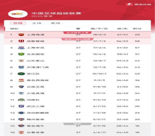 雷速体育10月19日宣 随着长春亚泰客场0-2不敌河南队,中超联赛第27轮全部赛程结束,上海海港在本轮以4-3险胜青岛海牛,积60分以2分优势继续领跑积分榜,蓉城、申花本轮有惊无险取胜紧随其后,北京国安换帅后不敌保级队深圳新鹏城,彻底掉出争冠行列。青岛海牛、长春亚泰本轮均输球,两队同积18分深陷降级区。